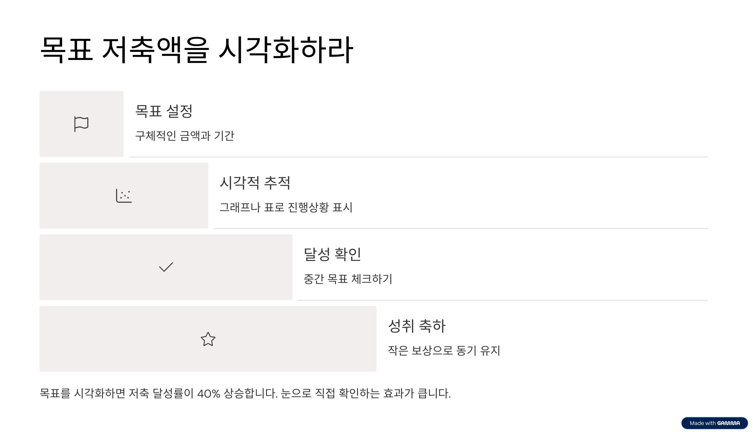 시각화된 목표는 동기를 높이고, 중간에 흔들리지 않게 해주는 장치가 됩니다.